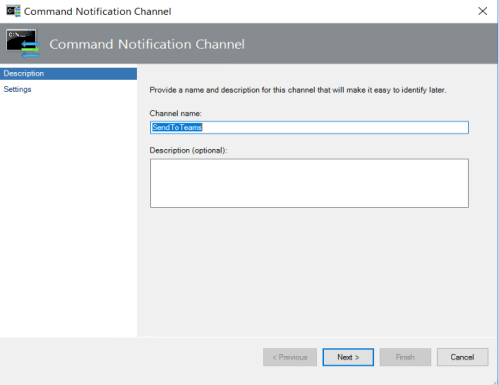 - Name this Notification channel and click Next. In this example we have named the channel SendToTeams. At this stage, you may want to create a command channel for each technology stream that will send to different Microsoft Teams channels.