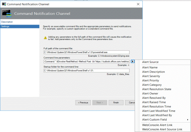 - -Command ” &{Invoke-RestMethod -Method Post -Uri ‘https://outlook.office.com/webhook/123456@123456/IncomingWebhook/123456/123456’ -Body (ConvertTo-Json -InputObject @{‘Title’=’$Data[Default=’Not Present’]/Context/DataItem/ManagedEntityPath$\$Data[Default=’Not Present’]/Context/DataItem/ManagedEntityDisplayName$ : $Data[Default=’Not Present’]/Context/DataItem/AlertName$’;’Text’=’Resolution State: $Data[Default=’Not Present’]/Context/DataItem/ResolutionStateName$
