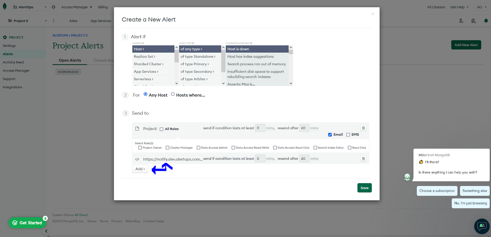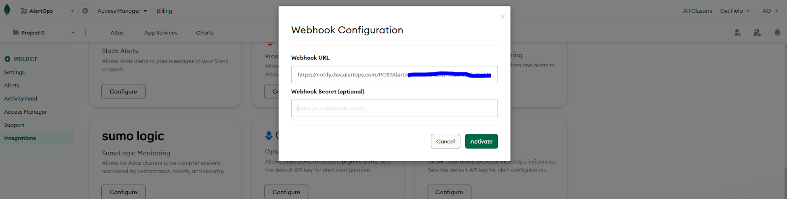 The above scenario and scope for integration is due to the fact that AlertOps has a very flexible and simple API/Webhook configuration feature that can be leveraged with MongoDB Cloud's alert and notification capabilities.