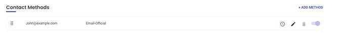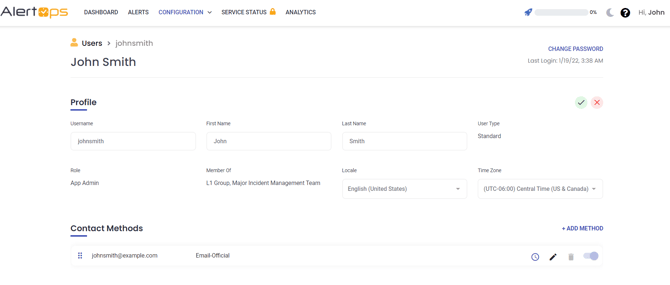 Contact Methods define the way in which AlertOps contacts a specific user. You may select contact methods such as email, SMS, or phone. Push notification contact methods are added automatically after a user registers their AlertOps mobile app.