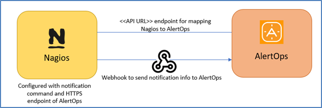At a high level this is how the flow looks like, you define an API integration in the AlertOps platform by defining settings like Integration Name, Escalation rules, recipient users/groups. Once an integration is defined, a unique API URL is generated. This acts as webhook or the gateway through which notifications from Nagios reach AlertOps and thus an incident/alert is created correspondingly. The API can be defined with various settings like URL mappings, filters, escalations etc. as required. Nagios should be defined with a command object to send out a POST request to the HTTPS endpoint defined here.