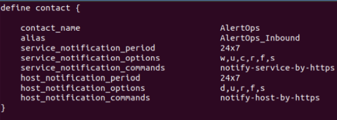 The host and service config objects are to be attached to a contact called “AlertOps” and a contact group called “AlertOps_group1”, which are again defined as contact objects attached to notification command objects. Make sure you add the above contact and contact groups to the host and service objects you define. The following set of instructions assumes you have created the host and service objects with the necessary contact information macros.