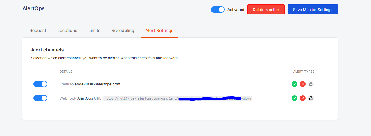 The above scenario and scope for integration is due to the fact that AlertOps has a very flexible and simple API/Webhook configuration feature that can be leveraged with Odown's alert and notification capabilities.