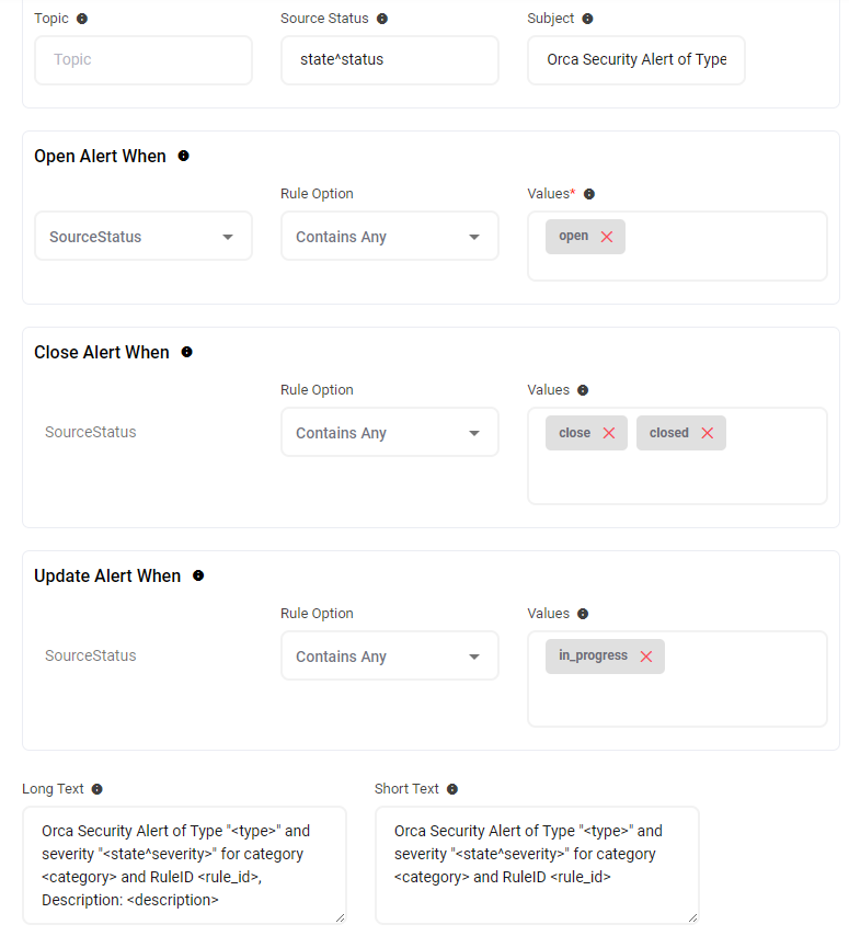 AlertOps will automatically create an incident when a new alert is received from Orca Security when the state^status field contains "open".