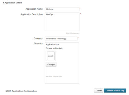 - Enter a Name, Description, and Category for the AlertOps Application and then click Continue to Next Step.