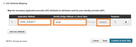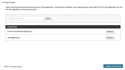 - Once Advanced Attributes are configured, continue to the next screen. From the Group Access, you can search and add groups. Once groups are added Click Continue to Next Step.