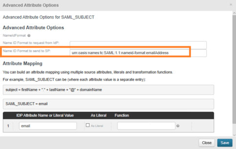 - Click the Advanced button to configure Advanced Attribute Options. Save Name ID Format to send to SP as: