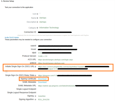 - Finally, in the Review Setup screen download Signing Certificate and copy Initiate Single Sign-On (SSO) URL to use in AlertOps SSO configuration.
