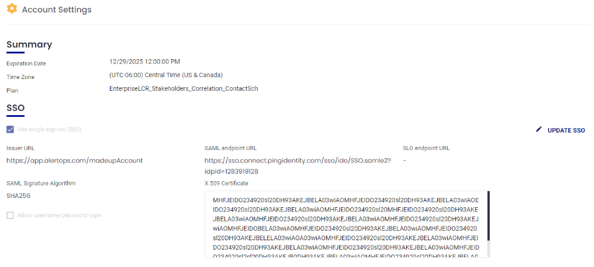 - Click UPDATE SSO and check the Use Single Sign On (SSO)box and enter and save the following enter and save the following: