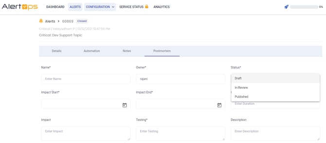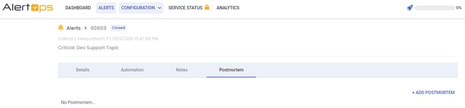 Once an alert has been closed, the Postmortem tab becomes visible in the Alert Detail. Click Add Postmortem to create a report.