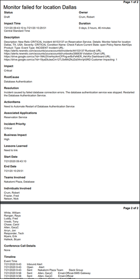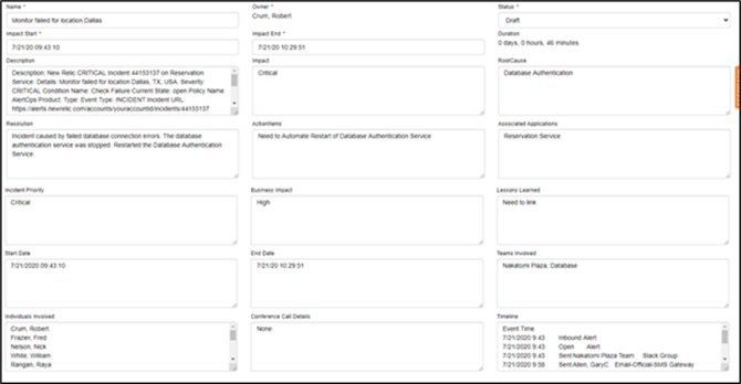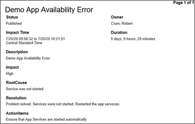 The Postmortem Report contains the standard fields pictured below. There are three report states: Draft, In-Review and Published. You may Export the Report to PDF at any time.