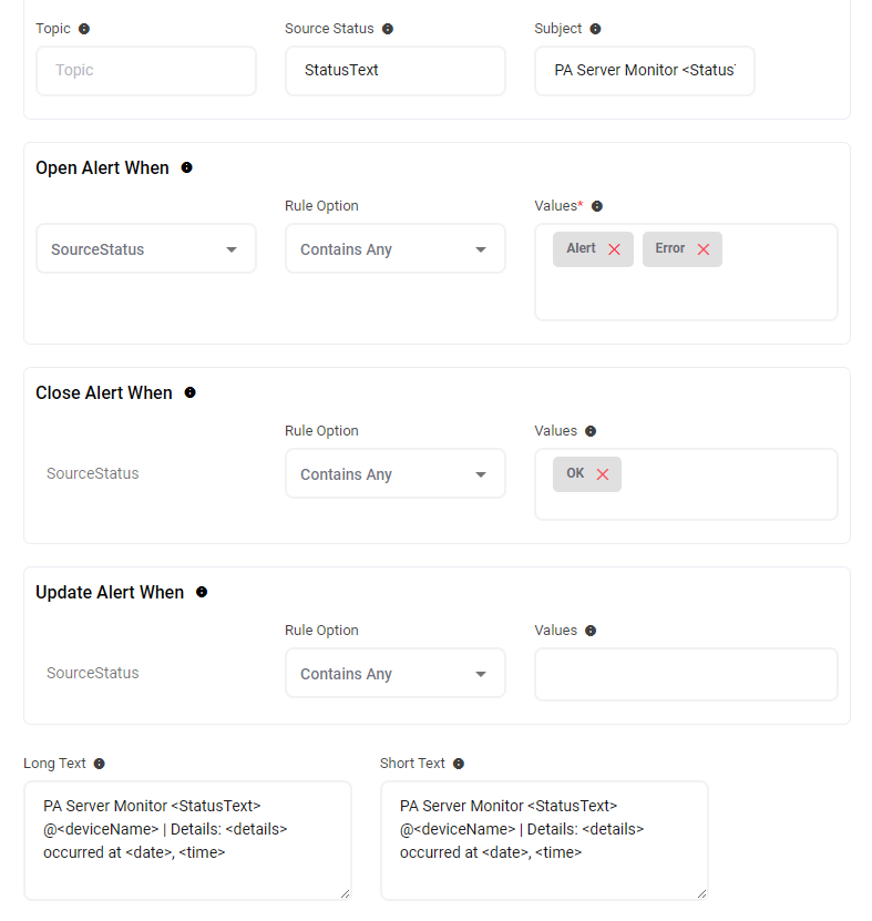 AlertOps will automatically create an incident when a new alert is received from PA Server Monitor when the StatusText contains "Alert/Error".