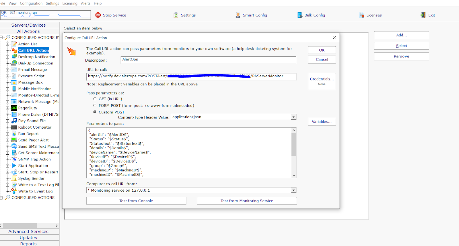 - Make a note of the API URL, which will be used in PA Server Monitor, so it calls a HTTP POST request to this URL with the body in JSON format containing the alert specific information. AlertOps automatically creates an alert when the status variable (StatusText) contains 'Alert/Error'. The incident will also be closed automatically when the status 'OK' is received from PA Server Monitor
