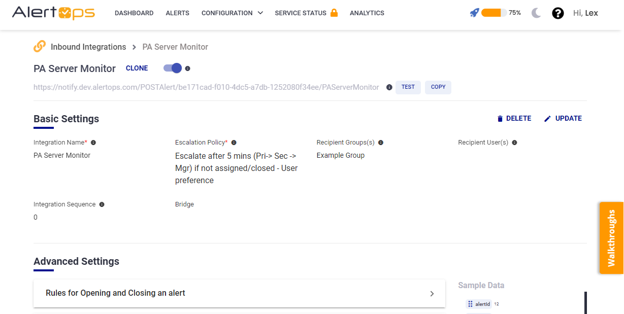 - You can similarly define Rules for Opening and Closing Alerts as you want in Advanced settings, owing to the flexibility provided by AlertOps� OpenAPI/Plug-and-Play integrations. You can provide other filters and match with regex expressions as well. You can also test the generated URL with the sample data provided.