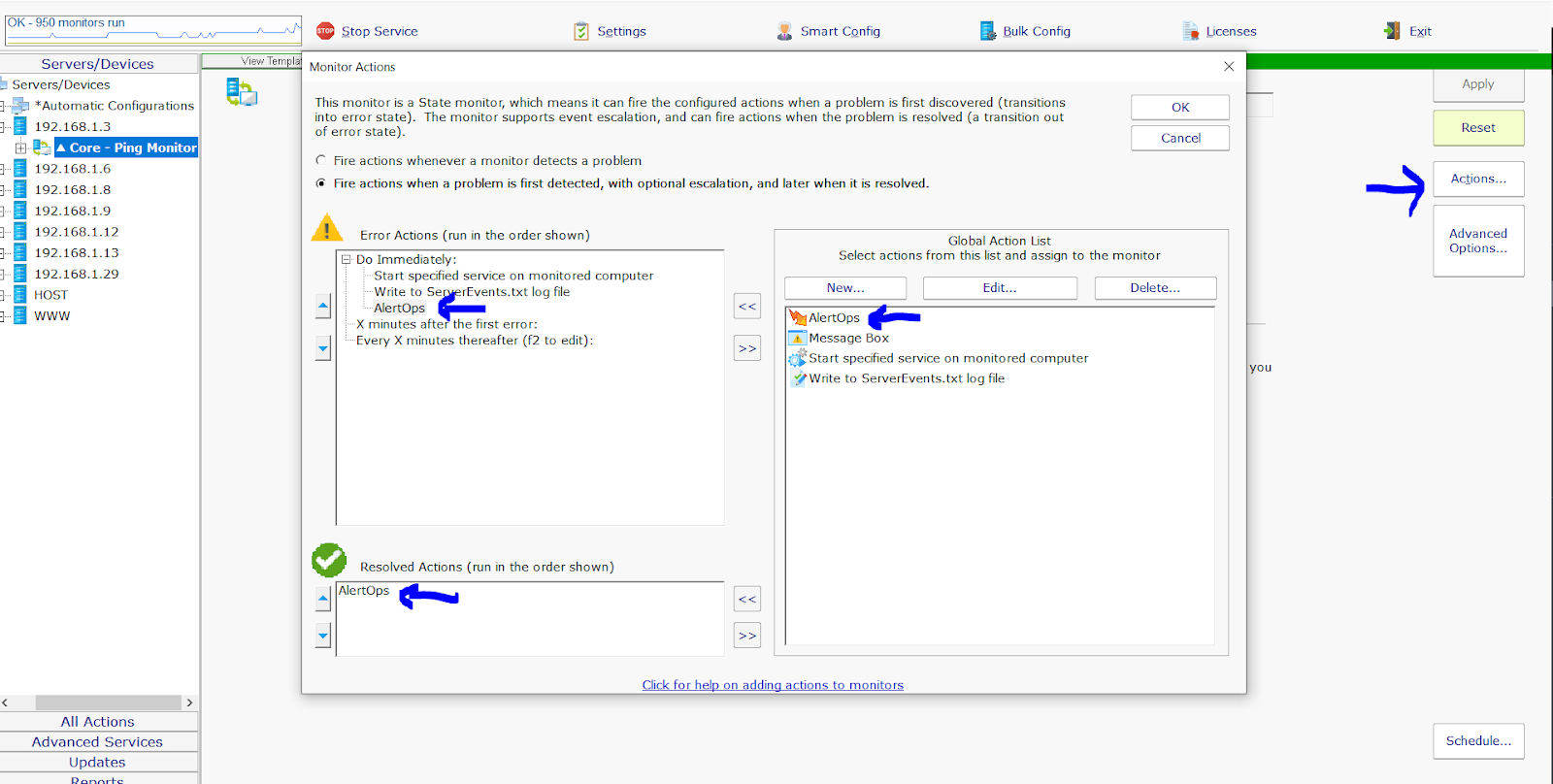 - After creating the Action, make sure the monitor(s) under Servers/Devices, has the AlertOps Action under the Monitor's Action settings for both 'Error Actions' and 'Resolved Actions'
