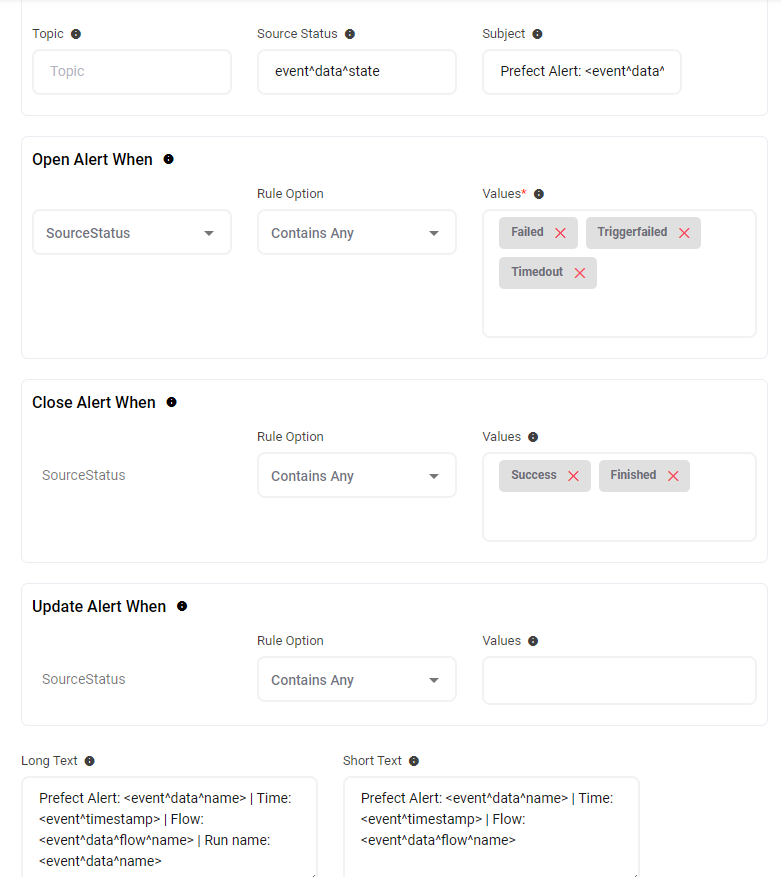 AlertOps will automatically create an incident when a new alert is received from Prefect when the event^data^state contains "Failed/Timedout/Triggerfailed".