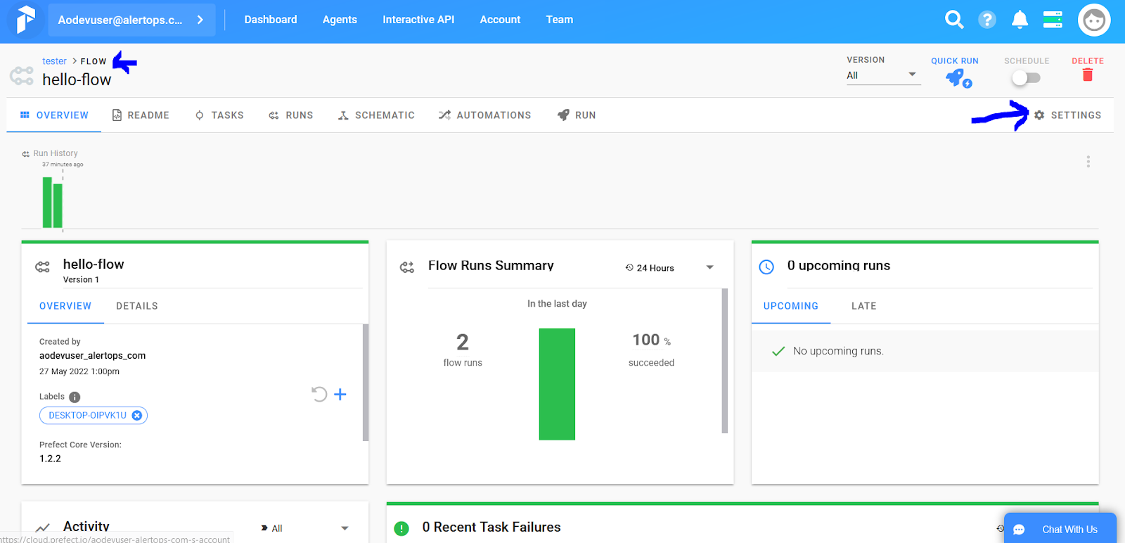 - In your Prefect Cloud portal, select your Flow and select 'Settings'