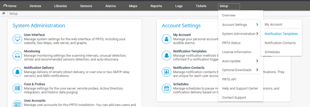 Step 1: In the PRTG Network Monitor menu option Select Setup -> Account Settings -> Notification Templates