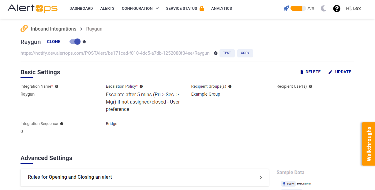 - Once you click save, the API Integration will be created, and you will be given a unique URL which acts as the access point and needs to be configured at the source (in this case Raygun), to send alerts. You can find the integration you just created, and you can give advanced settings and define various configurations for the alerts to be received and processed. For example, you can define when to open and close alerts based on the payload obtained from the API call, filters etc.