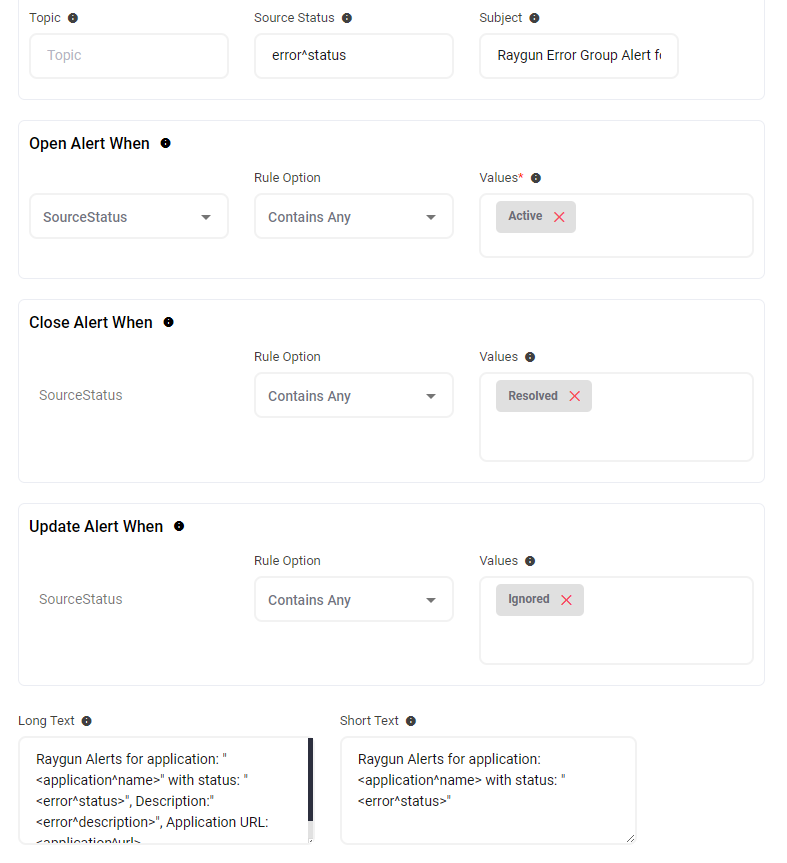 AlertOps will automatically create an incident when a new alert is received from Raygun when the error^status field contains "Active".