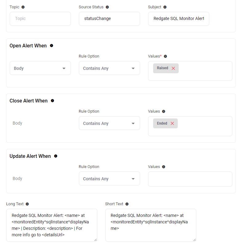 AlertOps will automatically create an incident when a new alert is received from Redgate SQL Monitor when the statusChange contains "Raised".