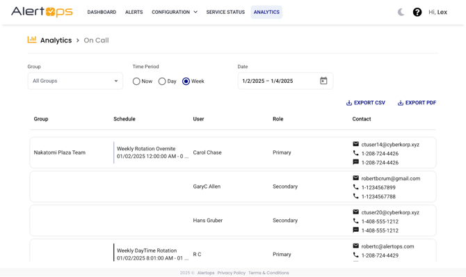 - Export Options: Users can download the on-call schedule as a CSV or PDF file.