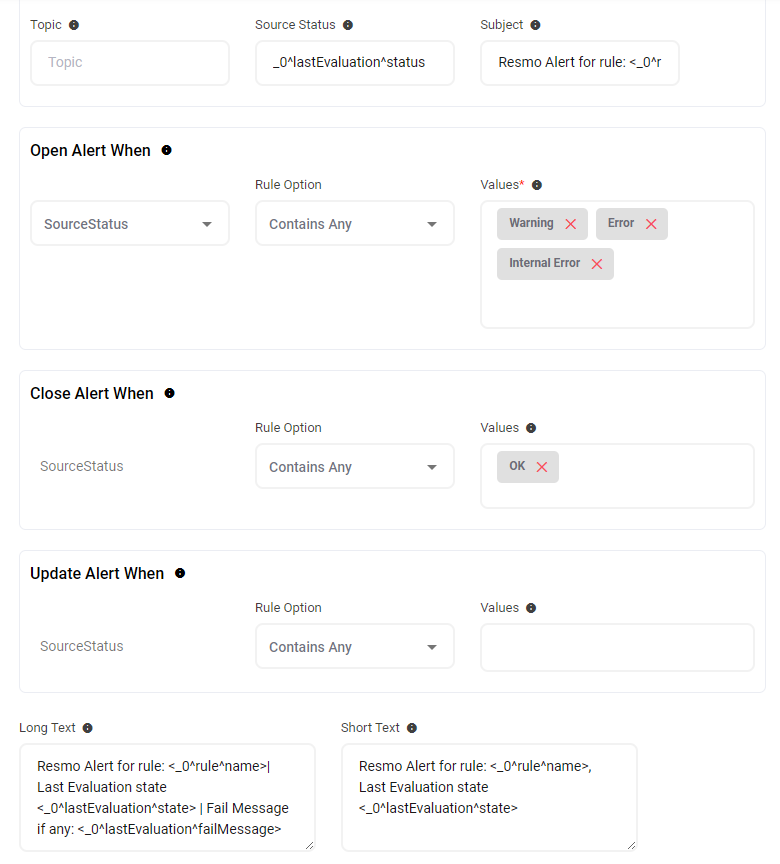 AlertOps will automatically create an incident when a new alert is received from Resmo when the _0^lastEvaluation^status contains "Warning/Error/Internal Error".