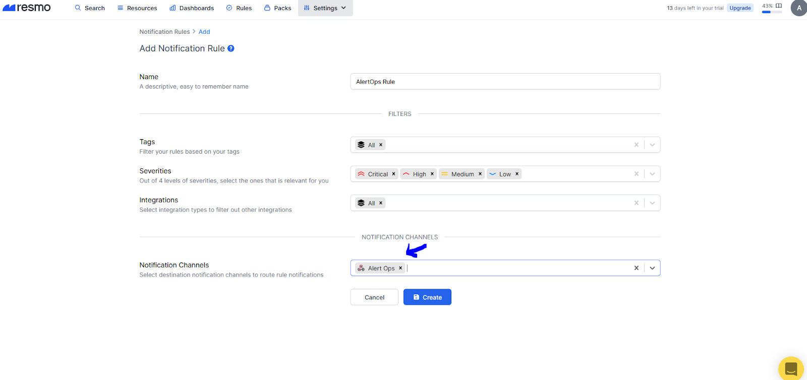 - Ensure that you create a Notification Rule for your integration with the AlertOps Webhook Notification Channel selected. Also ensure that the following severities are selected. (Critical/High/Medium/Low)