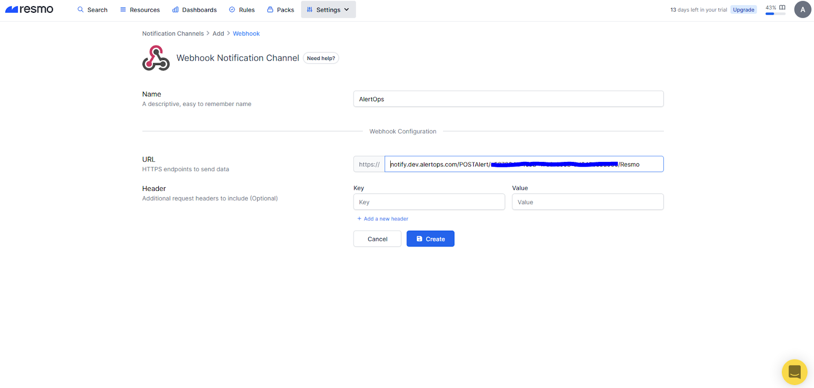- Give the Integration a name, under URL, paste the AlertOps Inbound Integration API URL. Leave the rest default. Create.