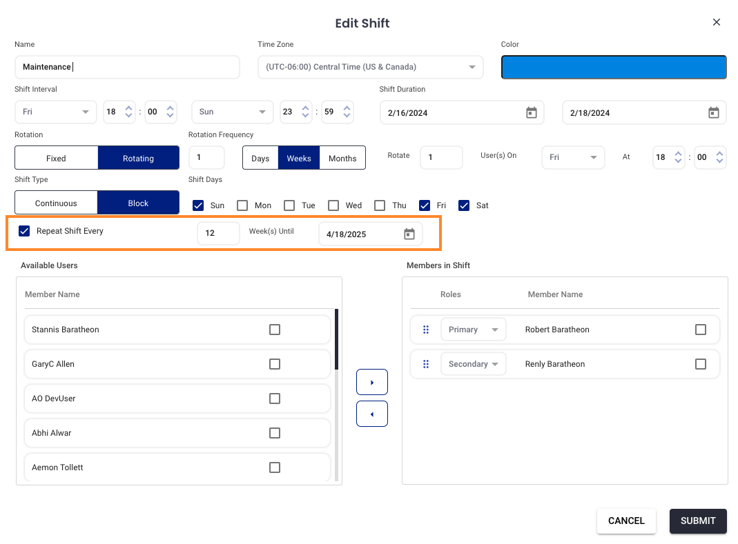 In this example, an organization has scheduled maintenance for one weekend every quarter. In the schedule shown below, we have set up a maintenance shift that covers one weekend, with one primary and one secondary. This schedule will repeat the same way, every 12 weeks, and will be in effect until 4/18/2025.