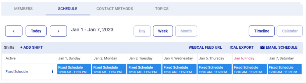 Fixed Shifts contain the same team member roles over the schedule period. You may define the days of the week, the hours of the day, and the on-call staff for each fixed shift.