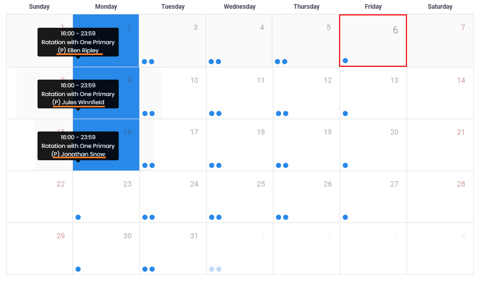 In the highlighted boxes you can see that this shift rotates primary and secondary roles every Monday. This is type of rotation is useful because it gives group members one week on as primary, one week off, and then one week as secondary.