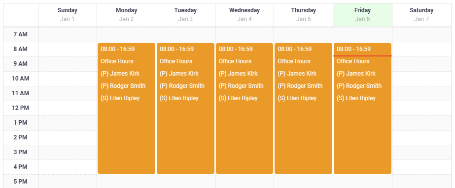 This example shows an overnight shift, Monday to Friday with each shift beginning at 5 PM and ending at 8 AM the following morning. Note that End Time is Saturday at 8 AM.