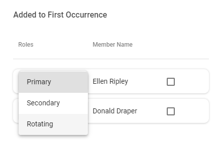 - For Rotating shifts, add users to the shift manually. To add users to the roster, click and drag available users into the Added to First Occurrence box. Then set the order that you would want them to rotate on-call and select a member role for each user in the schedule. A best practice is to set the top member in the list as Primary to align with the start date of the rotation.
