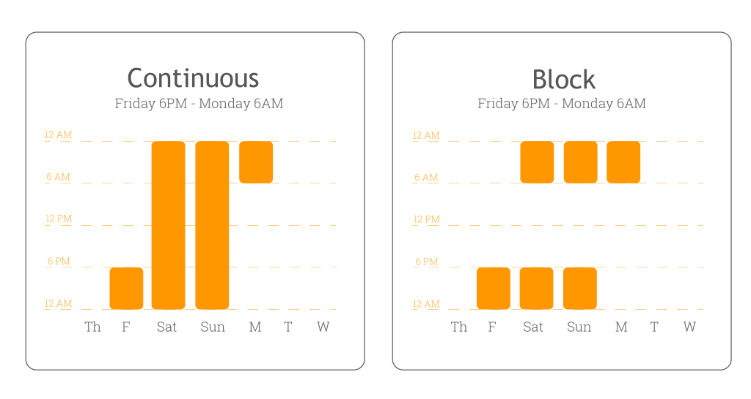 - A Continuous shift is uninterrupted, whereas a Block shift has a specific start and end day of the week. Daily time constraints will be based on the given specifications. as illustrated below.