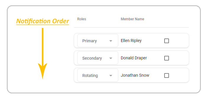 In the example rotation presented below, the current primary, Ellen Ripley, will be moved to the bottom of the queue and assume a rotational role. The current secondary, Jules Winnfield, will become the next primary and the user at the top of the standby will become the next secondary.