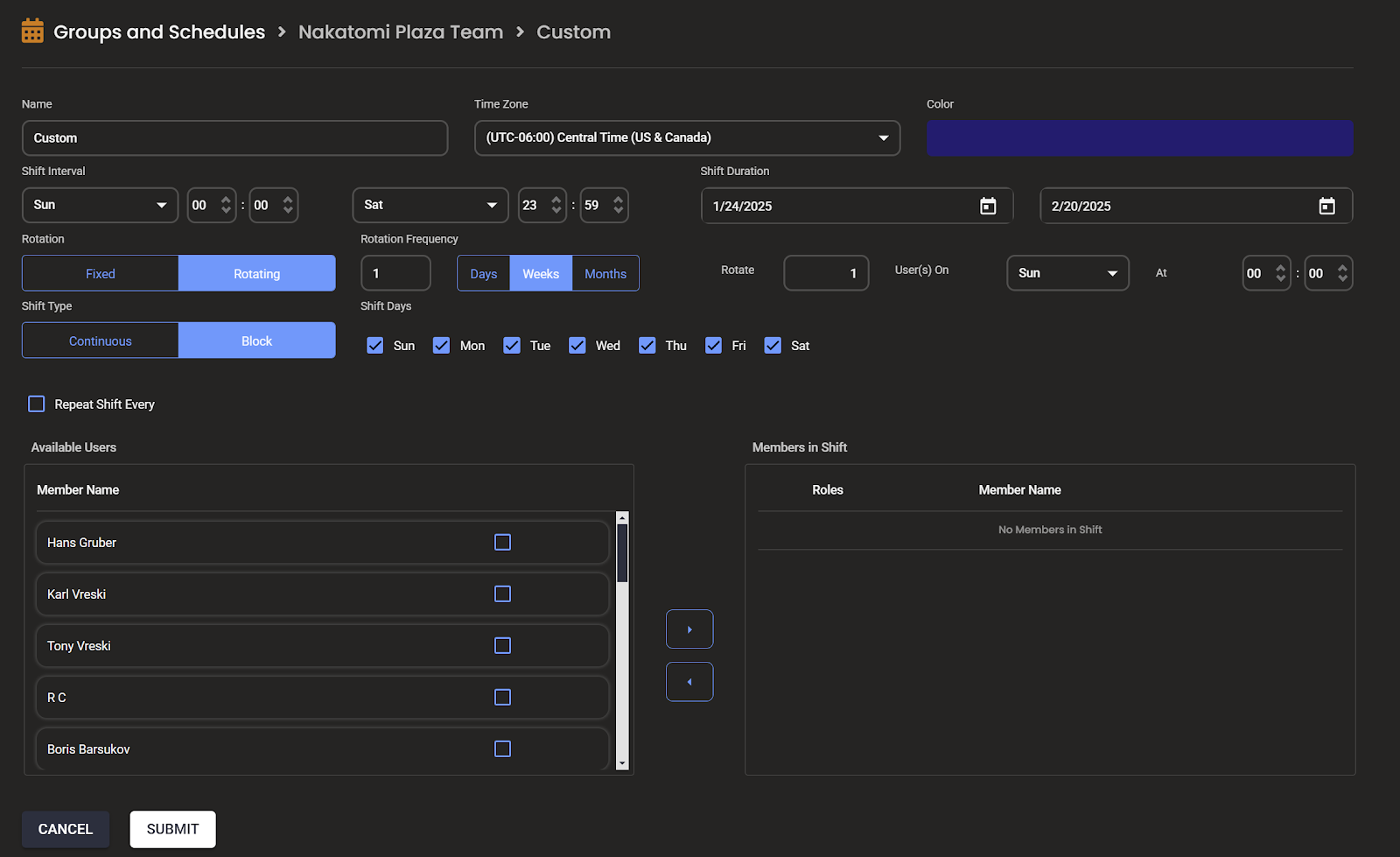 - In the Edit Shift dialog, scroll down to Members in Shift.