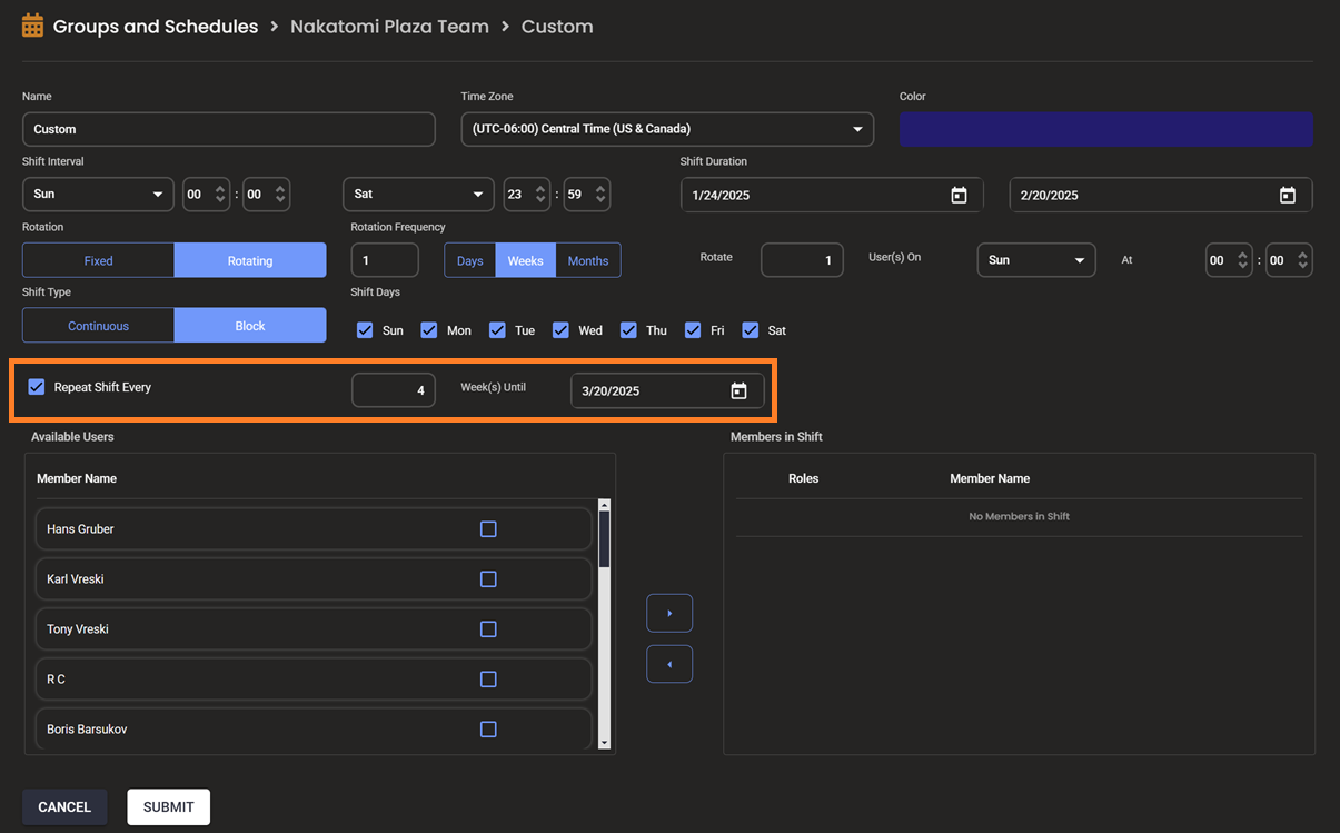 - The Repeat Shift option is available so users can easily set up a shift once and have it reset and repeat automatically at customizable intervals. Users can adjust the interval to match their specific scheduling requirements.