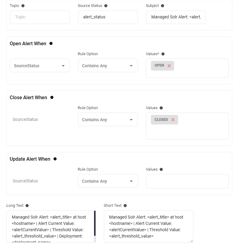 AlertOps will automatically create an incident when a new alert is received from Managed Solr when the alert_status contains "OPEN".