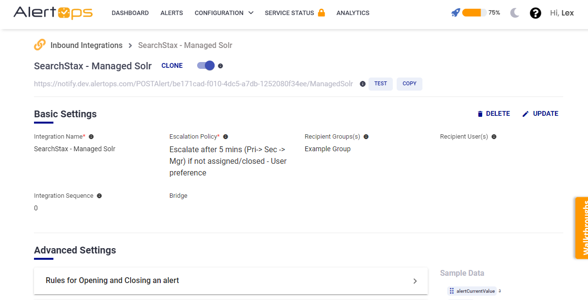 - Once you click save, the API Integration will be created, and you will be given a unique URL which acts as the access point and needs to be configured at the source (in this case Managed Solr), to send alerts. You can find the integration you just created, and you can give advanced settings and define various configurations for the alerts to be received and processed. For example, you can define when to open and close alerts based on the payload obtained from the API call, filters etc.