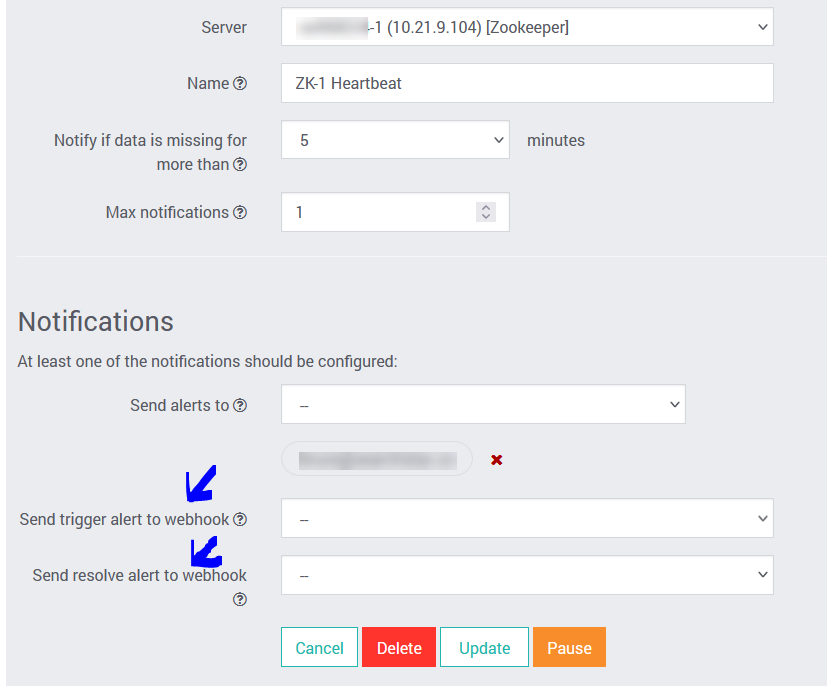 - Ensure that when you create Heartbeat or Threshold alerts for your deployment, under 'Notifications' the following events are enabled, and the webhook you created is selected.