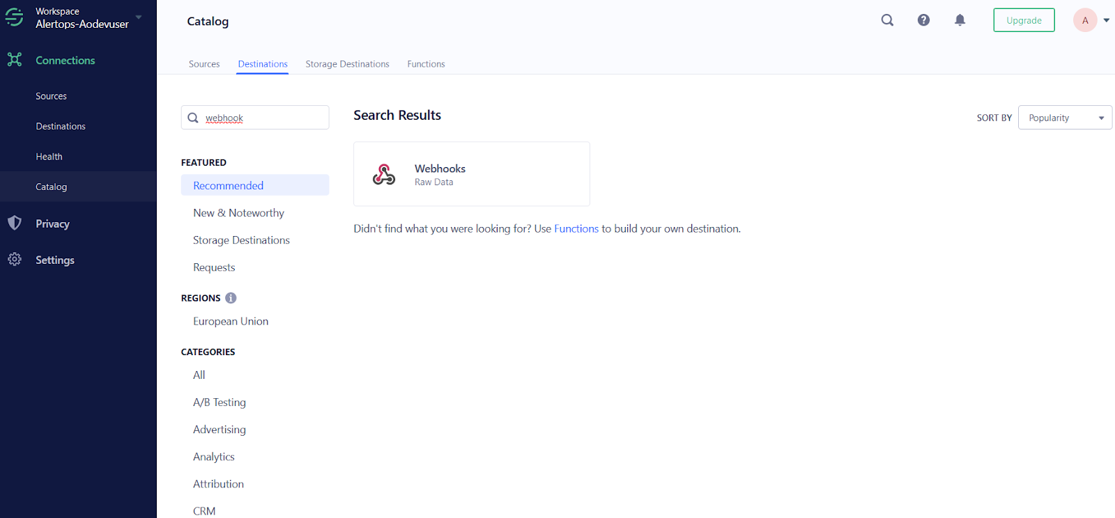 - In your Segment dashboard, go to 'Destinations', click on 'Add Destination' and then search/select 'Webhooks' from the Catalog.