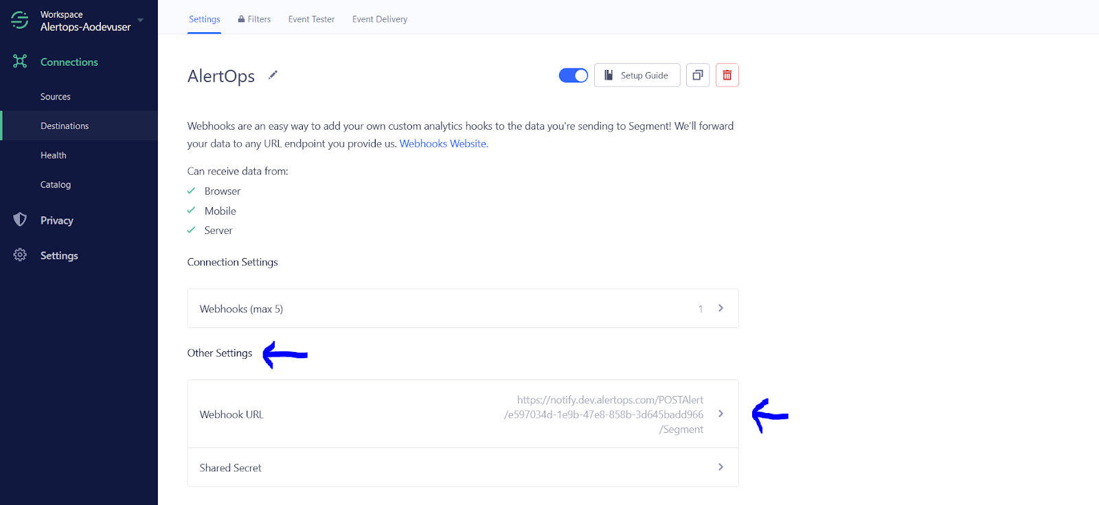 The above scenario and scope for integration is due to the fact that AlertOps has a very flexible and simple API/Webhook configuration feature that can be leveraged with Segment' destination transport capabilities.
