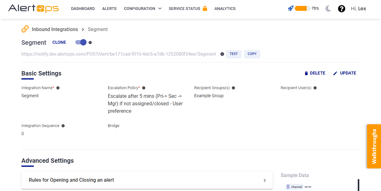 - Once you click save, the API Integration will be created, and you will be given a unique URL which acts as the access point and needs to be configured at the source (in this case Segment), to send alerts. You can find the integration you just created, and you can give advanced settings and define various configurations for the alerts to be received and processed. For example, you can define when to open and close alerts based on the payload obtained from the API call, filters etc.