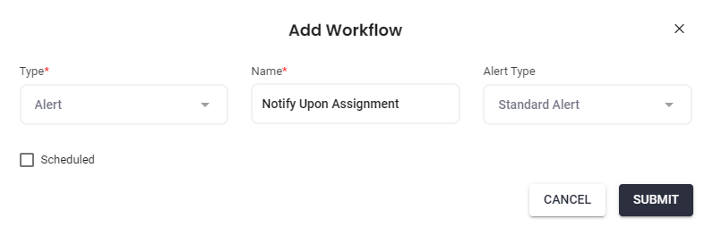 - In the resulting form, enter a Name for the workflow, in the Type drop down choose Alert. Leave the Template as Standard Alert and click Submit to save changes.