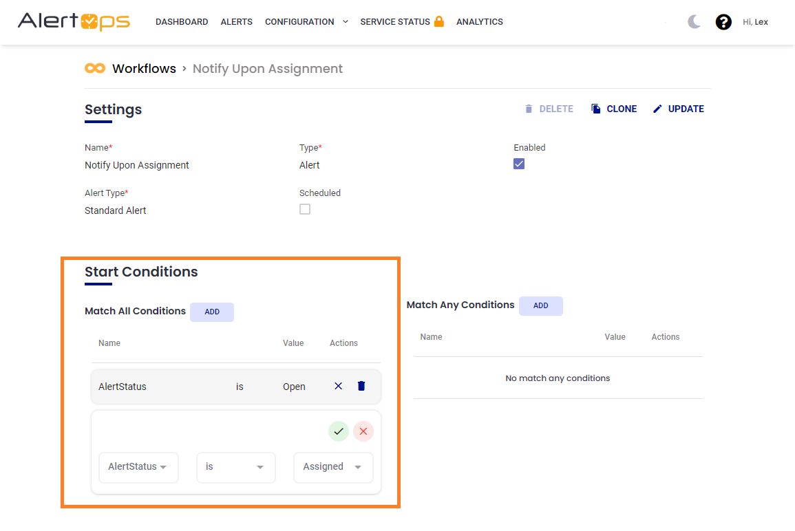 - In the dropdown for Name, select AlertStatus. Select Assigned as the Value and press the green checkmark to save.