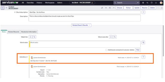 7) Work notes added in ServiceNow, will also be added to the Alert’s notes in AlertOps