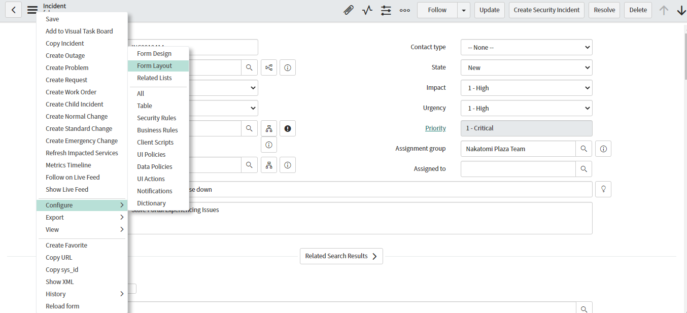Navigate to Incidents within Servicenow and select an existing incident. Within the Incident, use the top-level menu to navigate to Form Layout to add a custom field.
