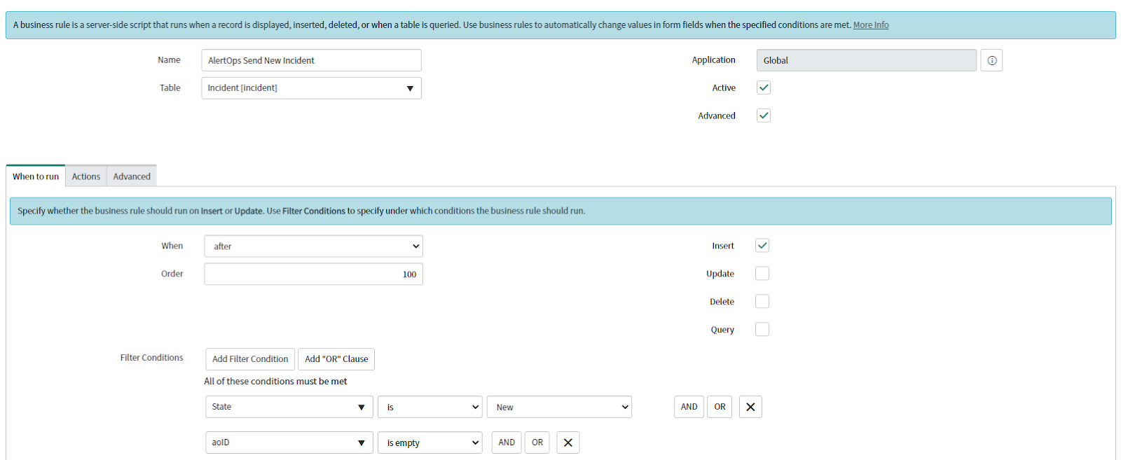 - Add Filter Conditions for Incident State is New. In addition, add a filter that only executes the business rule if the AlertOps ID field we created is empty. THIS IS CRUCIAL TO PREVENT REDUNDANT MESSAGES BETWEEN THE SYSTEMS.
