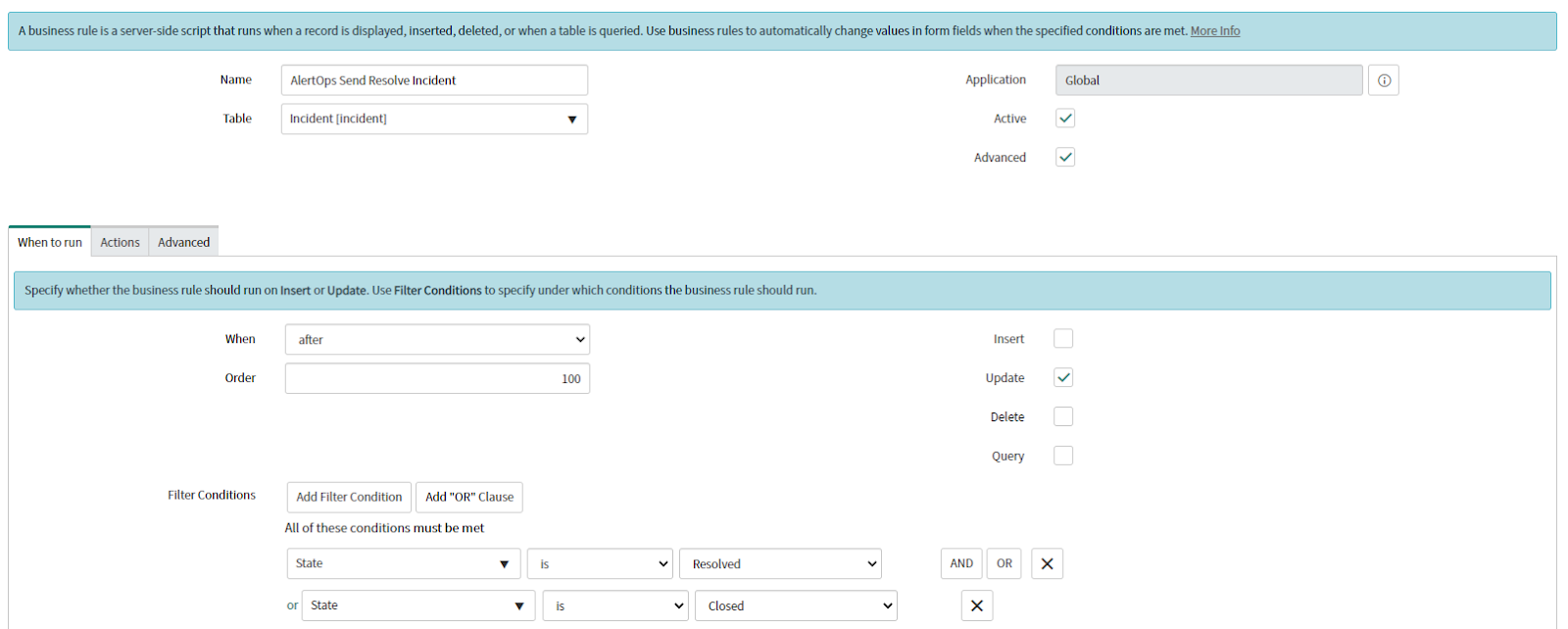 Business Rule: Close AlertOps Alert on Closed/Resolved Incident